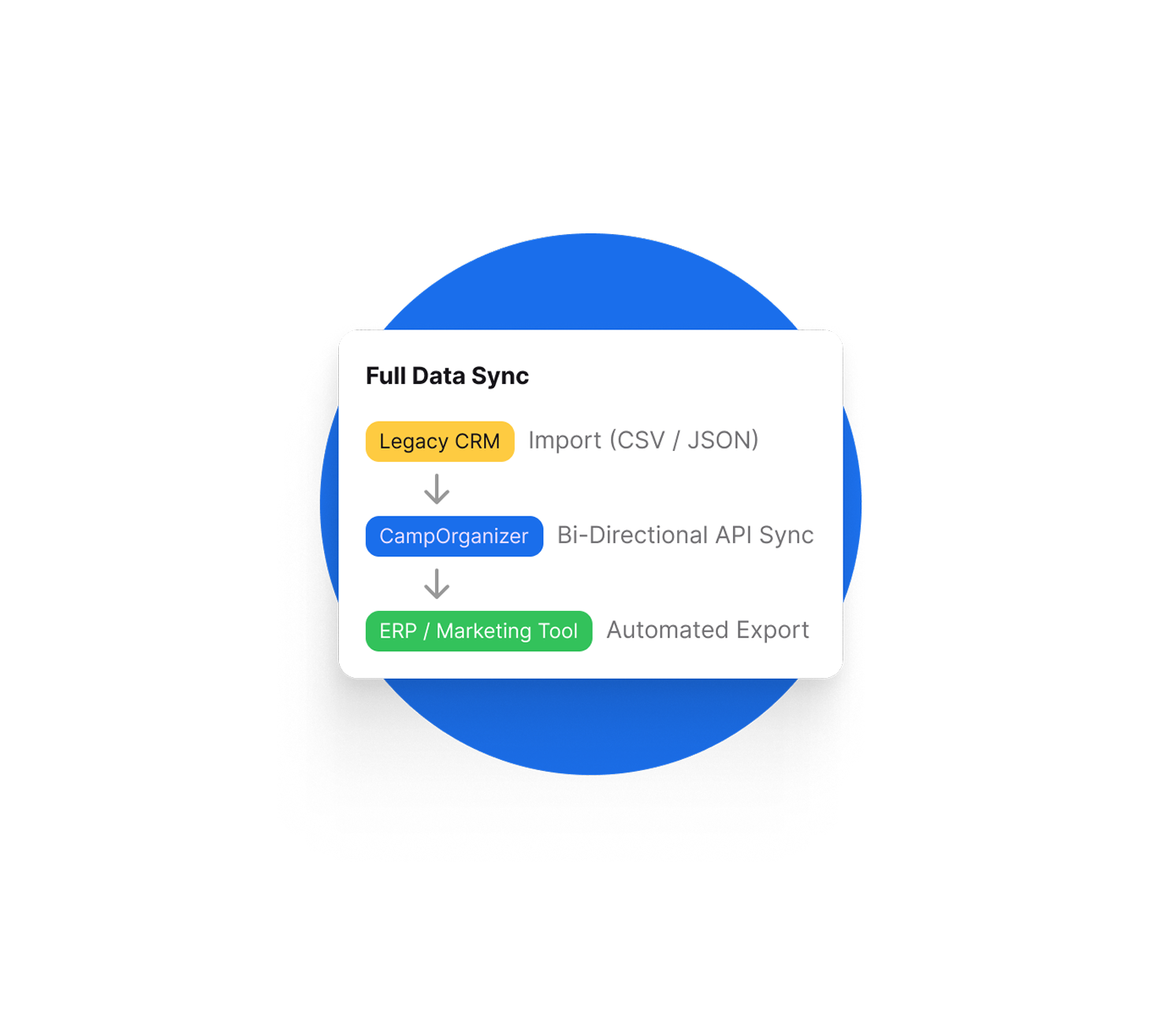 Easily migrate legacy data or keep CampOrganizer in sync with an external ERP or Marketing Automation tool.